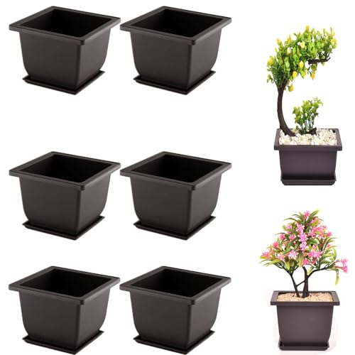 6 stycken rektangulär bonsai träningskruka, kruka med plastbricka, för trädgård, gård, sovrum, balkong (fyrkantig), mörkbrun, 13 x 13 x 9,8 cm/5,12 x 5,12 x 3,85 tum, (Morlight066)