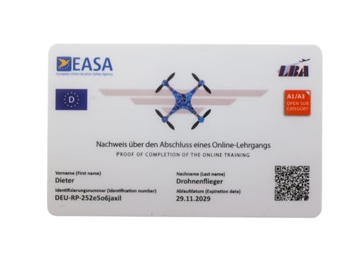 MJ drönare körkort – med QR-kod fotoID och adress på baksidan, kompetensbevis för A1-A3, A2 eller STS-licens i checkkortstorlek, högkvalitativt plastkort med EASA-korthållare som tillval