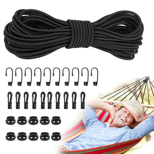 SWTYExt 20 m svarta bungee-snören med krokar set bungee-rep 4 mm elastiskt rep 50 st plastkrokar kraftigt elastiskt rep för släpvagn presenning camping poolöverdrag tältstång cykeltransport