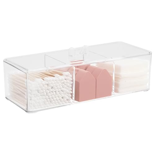 APOMOONS 3 fack bomullspinnar behållare transparent, badrumsorganisatör stapelbar, plastlåda med lock, kosmetikaarrangör smink, bomullskuddar förvaring för badrum, tvättställ, kök