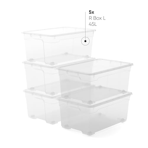 Keter Set med 5 plastlådor med lock R Box L, transparent, med hjul, lämpliga för skåp och garage, 45 l, 56,5 x 38 x 26 H cm
