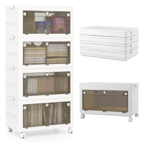 Fantask Vikbara förvaringsbehållare med lock, 105 l förvaringslådor, förvaring av 3 plastlådor stapelbar, förvaringsbehållare med hjul och dörrar, 49,5 x 31,5 x 86 cm, stapelbara lådor plast, vit