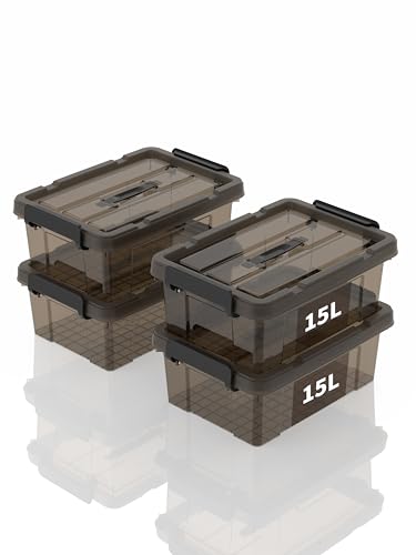 SpaceXpert förvaringslådor, förvaringsboxar, bärbara plastlådor med handtag, stapelbara organisatörbehållare för sovrum, skräp, skola, transparent svart, 15 l (set med 4 st)
