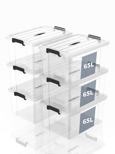 SpaceXpert förvaringslådor, förvaringslådor, bärbara plastlådor med handtag, stapelbara organisatörbehållare för sovrum, skräp, skola, transparent, 65 l (set med 6 st)