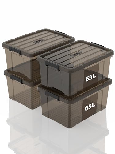 SpaceXpert förvaringslådor, förvaringsboxar, bärbara plastlådor med handtag, stapelbara organisatörbehållare för sovrum, skräp, skola, transparent svart, 65 l (set om 4)