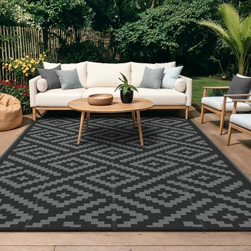 GENIMO Utomhusmatta 240x300cm Vattentät UV-beständig, Reversibel Vikbar Maskintvättbar Picknick Plastmatta för Balkong, Trädgård, Terrass & Camping, Rutmönster Svart och Grå
