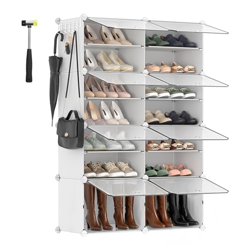 SONGMICS Skoskåp i plast, 8 fack, modulärt skoställ, modulär plasthylla, 30 x 40 x 30 cm varje hink, med dörr, stålram, plastpanel, vit LPC034W01