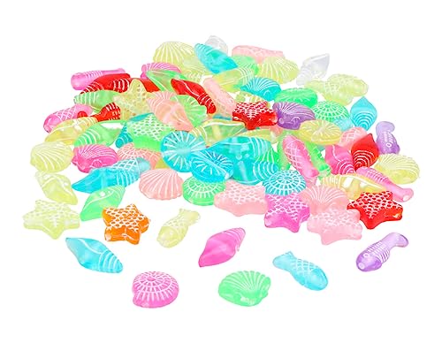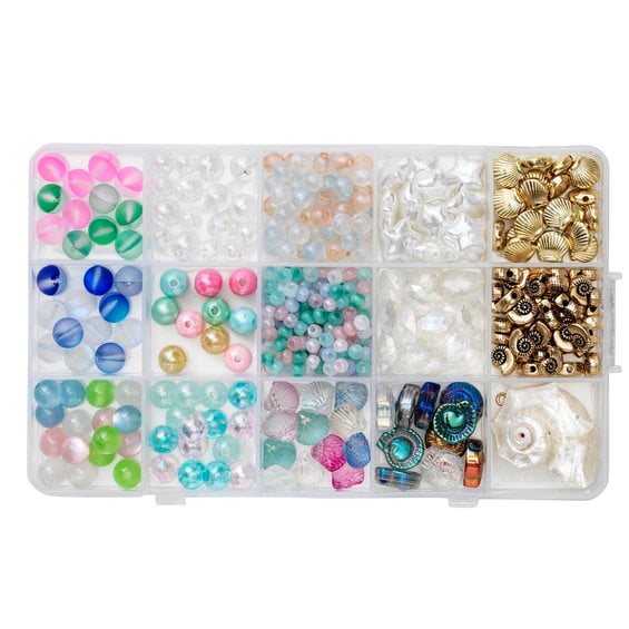 Pärlmix med glas- och plastpärlor i havstema + 1 charm av havssnäcka