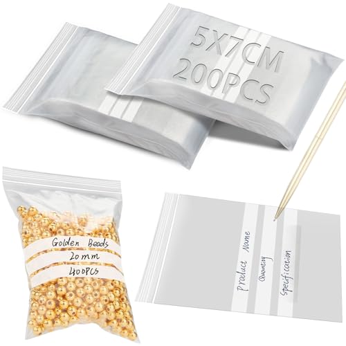200 st återförslutningsbara påsar skriver 5 x 7 cm grepptätningspåsar på panel provpåsar med vita remsor, återförslutningsbara plastpåsar, 5 x 7 cm, plasttätningspåsar med dragkedja för förvaring
