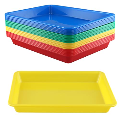 KEILEOHO 20 stycken plastbrickor, 28 x 21 x 3 cm, färgglada materialskålar, serveringsbricka, 4 färger, aktivitetsbricka, materialskålar, set, stapelbara plastskålar, rektangulära, flerfärgade, ro