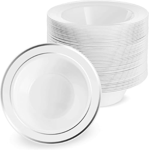 MATANA 25 premium vita plastskålar med silverkant, 360 ml – robusta och återanvändbara – soppskålar, dessertskålar för bröllop, födelsedagar, picknick, buffé, catering, fester