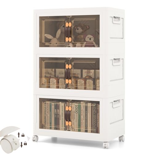 KOMFOTTEU Plastbehållare med lock med behållare och dörrar förvaringslåda med 4 hjul, plastskåp, varje våning tar upp till 5 kg (stor till 3 behållare)