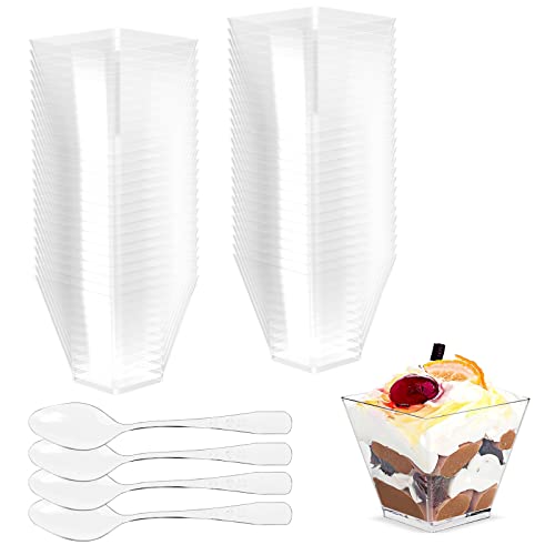 Gvolatee 50 stycken 2 oz/60 ml dessertkoppar med plastskedar, koppar koppar dessertskålar återanvändbara fyrkantiga genomskinliga för pudding, mousse, glass, födelsedag, bröllop