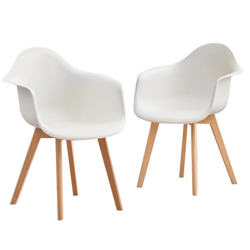 GrandCA HOME Set med 2 matsalstolar, matrumsstolar, set om 2, fåtöljstol, lämplig för sovrum, kök, matsal, kontor, plaststol, ben av massivt trä (vit, 2)