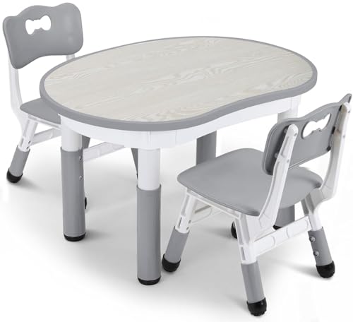 Barnbord med 2 st stolar, höjdjusterbart barnbord och stol, plaststol, jordnötsform, för hem/daghem, dagis, grå