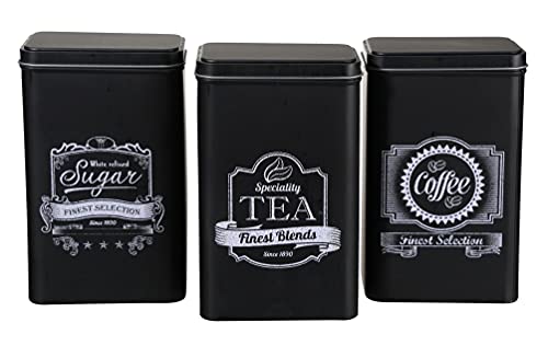 MIK funshopping set retro metallburk plåtburk kaffe, te och socker – kaffeburk, teburk, sockerskål med lock (3-delad vintage design svart-vit)