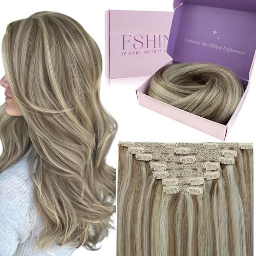 Fshine Clip in Hair Extensions äkta hår 35 cm dubbla hårförlängningar äkta hår billig askbrun mix platinum blond 7 stycken 120 g äkta hår med clips i färgen 8P60