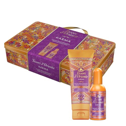 Tesori d'Oriente, Karma presentset, inkluderar 250 ml krämdusch och aromdoft 100 ml, färsk och blommig doft, anteckningar från Bergamott, Nashi, vanilj och tonka älva, plåtlåda