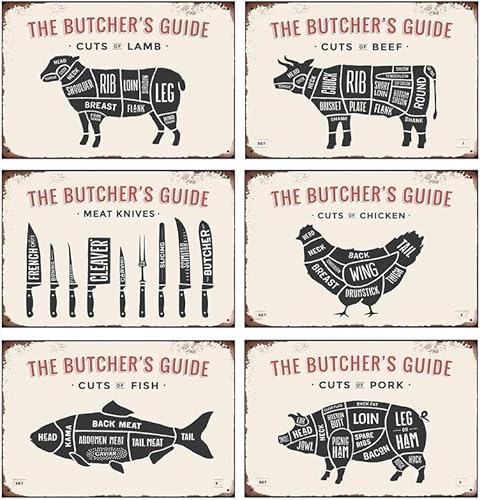 Retro metall plåtskylt 6 st klipp av lamb biff kyckling fisk pork kött knölar plåtskyltar 'The BUTCHER'S GUIDE aluminium metallskylt vintage väggdekor för café bar pub hem garage kaffedekor 20 x 30 cm