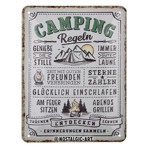 Nostalgisk konst retro plåtskylt, 15 x 20 cm, campingregler – presentidé för campingfans, av metall, vintagedesign, plåtskyltar ordspråk