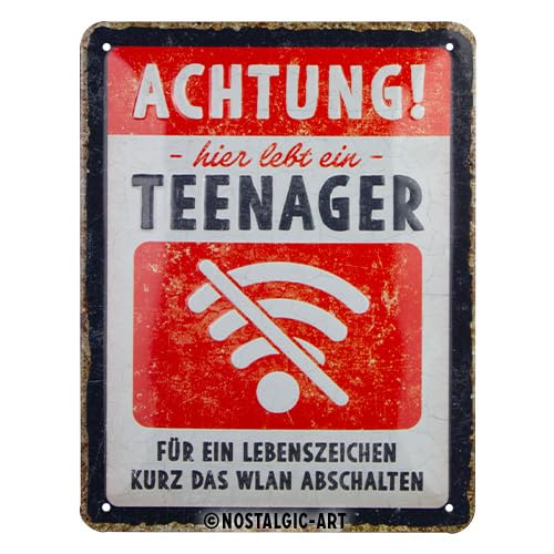 Nostalgisk konst retro plåtskylt, 15 x 20 cm, observera tonåring WLAN – varningsskylt som presentidé, gjord av metall, vintagedesign med ordspråk, plåtskyltar ordspråk