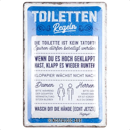 Nostalgisk konst retro plåtskylt, 20 x 30 cm, toalettregler – presentidé för toaletten, av metall, gästtoalettdekoration i vintagedesign med ordspråk, plåtskyltar ordspråk