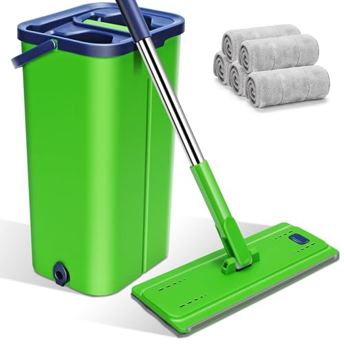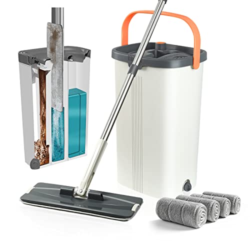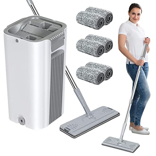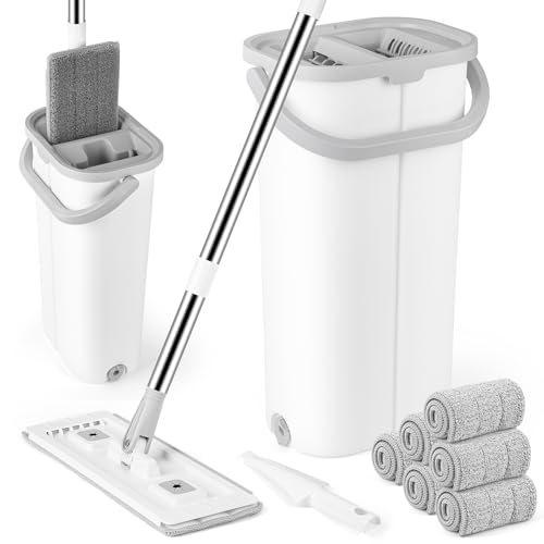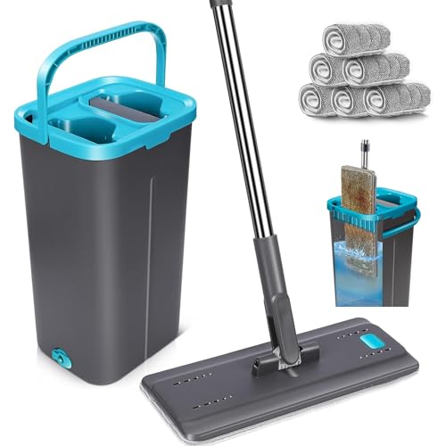 MASTERTOP Mopp- och hinkuppsättningar, platt mopp och hink med 140 cm långt handtag och 6 återanvändbara moppkuddar, kompakt skrapa rengöring hink mopp för laminatplattor, trägolv