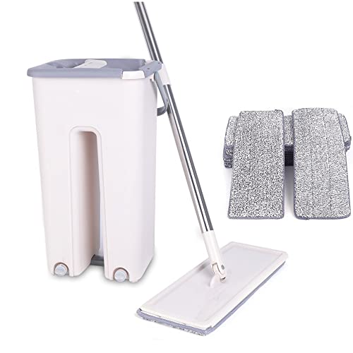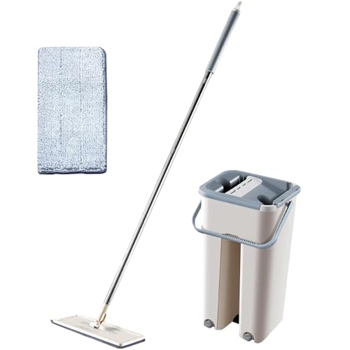 MASTERTOP Set med platt mopp och hinkar, moppar och hinkar, kompakta golvmoppar med 6 mikrofibermoppdynor och rostfritt stål långt handtag, moppar för rengöring av golv kakellaminat trä – beige
