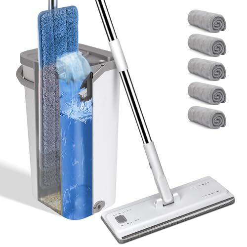 Masthome Golvmopp set med hink, platt mopp och rengöringshink, set med mikrofibermopp för våt- och torranvändning med 5 moppkuddar, golvtorkare med urvridningsfunktion för alla typer av golv