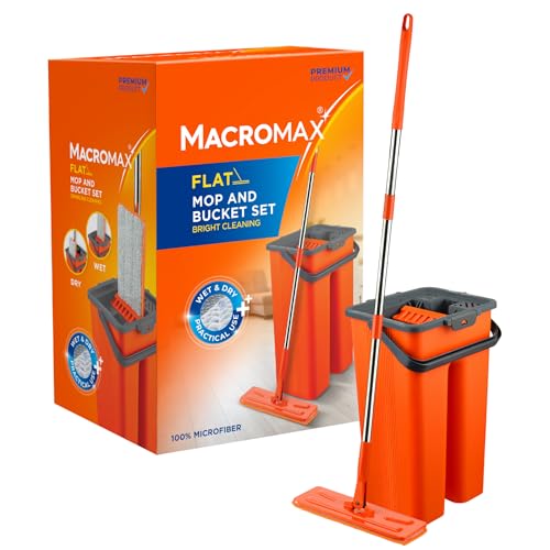Makromax platt mopp och hink-set, Aqua Revolution System med 8 l kapacitet, våt- och kemtvätt, tvättbara mikrofibermopphuvuden och ersättningar – 180° vridbart handtag, perfekt mopp för rengöring av