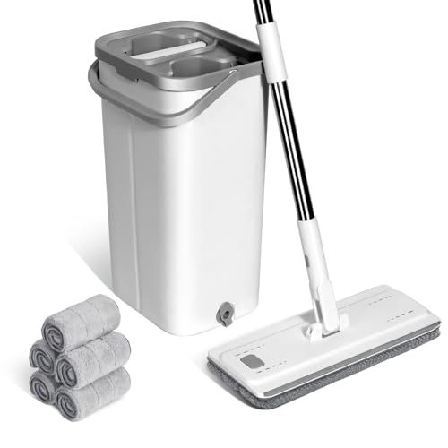 JOYMOOP mopp- och hinkset med urvridare, handfri platt golvmopp och hink, med 3 tvättbara mikrofiberdukar, för våt- och torranvändning, golvrengöringssystem