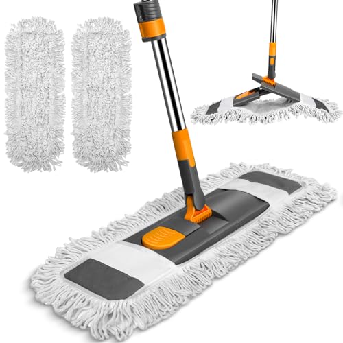 MASTERTOP Platt mopp, 60 cm breda industriella moppar med rostfritt stål långt handtag, kommersiell ren bomullsmopp med 2 återanvändbara dynor, våta och torra golvmoppar för rengöring av hårda