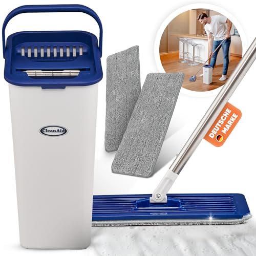 CleanAid Formosa 2 golvmopp set – 360° platt torkare, kompakt hink, extra lång 155 cm handtag i rostfritt stål, 2 mikrofibermopp – för alla släta ytor (mopp-set)