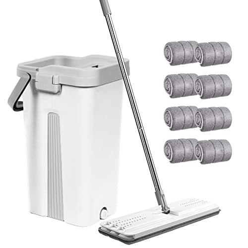 ASelected Platt mopp och hinkset, handsfree klämmopp med 10 återanvändbara moppdynor i mikrofiber och 123 cm långt handtag, golvmopp i mikrofiber för kakel, marmor, lövträ