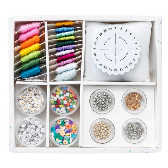 Kumihimo armband, kit med pärlor, smyckestrådar, tråd och kumihimo-platta