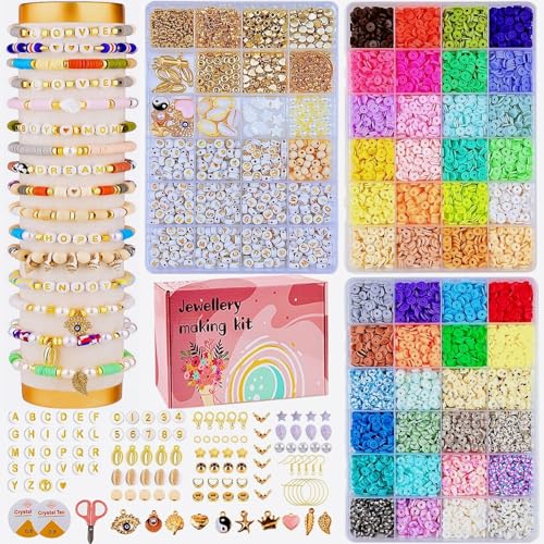 LUOBITO Kit för armbandstillverkning av lerpärlor, 10 800 st, 3 lådor, 48 färger, platta polymerlerpärlor, smyckesset, heishi-pärlor, vänskapsarmband, kit, bokstavspärlor och berlocker, hantverk,