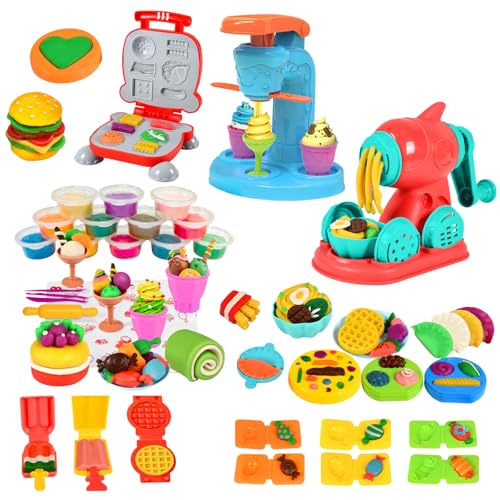YATOSEEN 3-i-1 knådande play Doh Set, maskin för beredning av glass, pasta och hamburgare, kreativ mat leksak för köket, lerleksaksset med 12 lerfärger för barn från 3 år