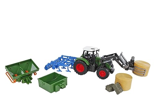 Kids GLOBE traktor med tillbehör 8 delar (grön bulldog med två höbalar, två sugrör bollar, tippare, frontlastare, plog och sakorg, jordbruk, bondgård) 540479