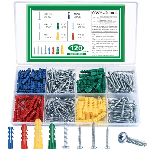Plugg och skruvar i set om 120 st., betongskruvar med plugg, slagpluggar för gipsskivor, skruvar och gipspluggar för betong, tegel och gipsskivor