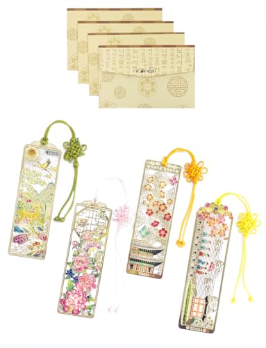4 Pieces Metal Bookmark (Peony, Ten Symbols of Longevity, Nadeul, Plum Blossom) + 4 Envelopes - Korean Traditional Bookmark 책갈피 목단, 십장생, 나들이, 궁궐매화