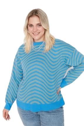 Trendyol kvinnor plus size vanlig dubbelbröst stående krage stickade kläder plus size jumper, Indigo, 3XL