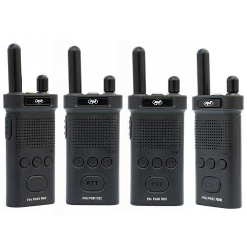 Kit med 4 bärbara radiostationer PNI PMR R60 446 MHz, 0,5 W, 16 programmerbara kanaler, 16 PMR och 50 CTCSS och 104 DCS-toner, skanning, nyckellås, SOS, skärm, 1 200 mAh batteri