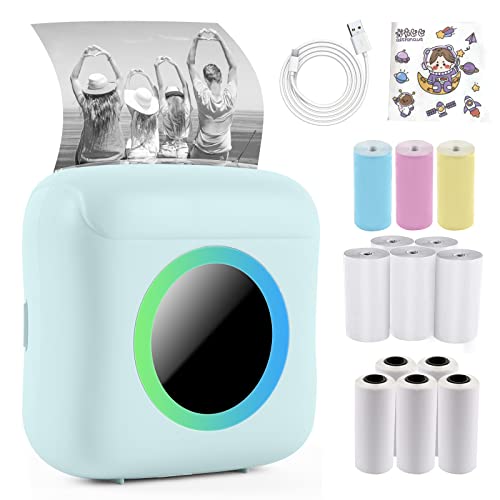 HUIJUTCHEN Mini fickskrivare bärbar termisk fotoskrivare med 10 rullar utskriftspapper för Android eller iOS-APP, Bluetooth bläckfri skrivare etikettmaskin (blå och vit)