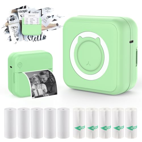 HUIJUTCHEN Mini fickskrivare bärbar termisk fotoskrivare med 10 rullar utskriftspapper för Android eller iOS-app, bluetooth bläckfri skrivare etikettmaskin (grön)