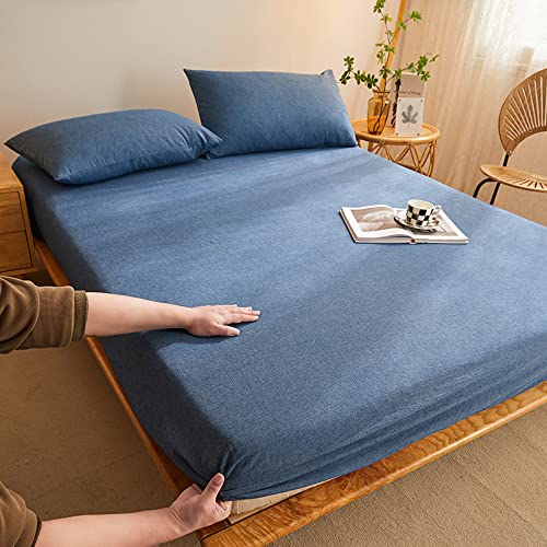 Plain Fitted Sheet,Pure Cotton Washed Cotton Deep Pocket Solid Fitted Sheet,Soft Comfortable Checkered Mattress Protector,Navy Blue,180 * 200cm+40cm