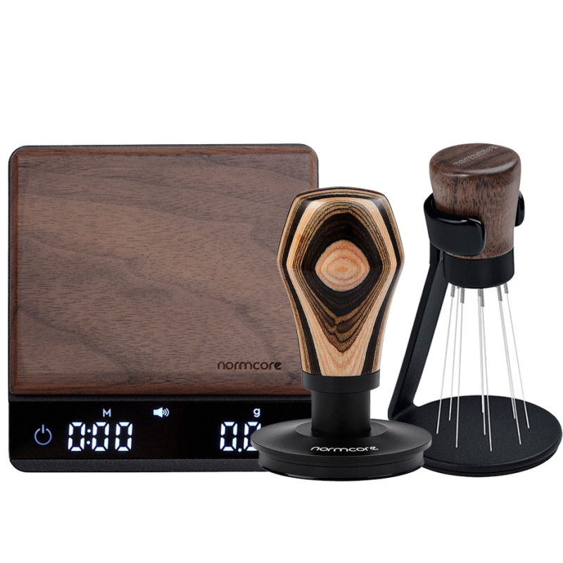 Normcore Pocket Scale Kaffevåg Inkl. WDT Tool V3 m. Hållare Valnöt & V4 Tamper med Fjäder, Spår & Titaniumbeläggning 58 mm Trä
