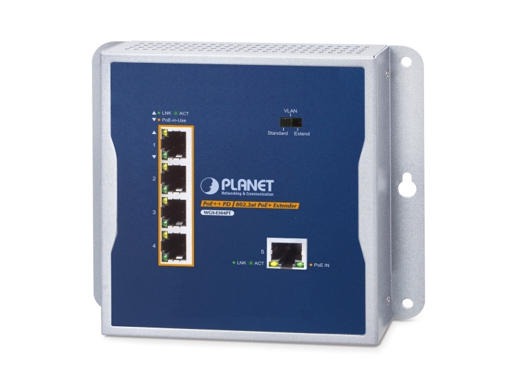 Planet Wgs-E304pt Industrial Poe+ Wall-Mounted Extender 1-Port Poe++ To 4-Port, Nätverkssändare Och -Mottagare, 2000 Poster, Ip30, Blå, Metall, Vägg