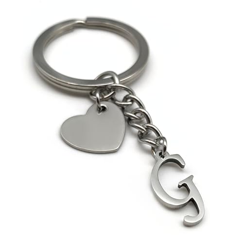 Nyckelring med Bokstav och Hjärta - Namn A-Z brev - Handgjorda hänge i rostfritt stål - Present pojkvän flickvän partner bil (G)