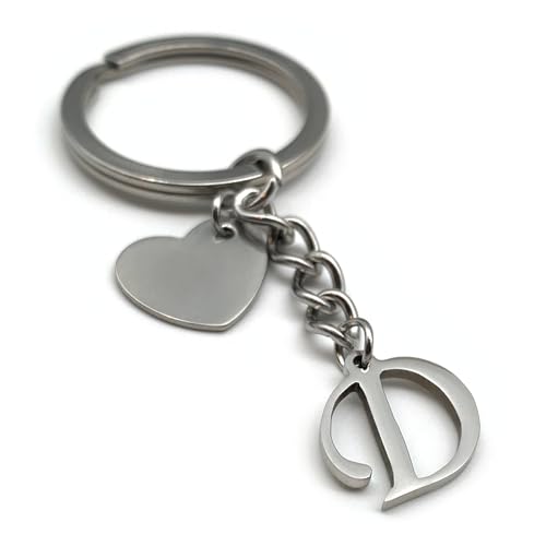Nyckelring med Bokstav och Hjärta - Namn A-Z brev - Handgjorda hänge i rostfritt stål - Present pojkvän flickvän partner bil (D)