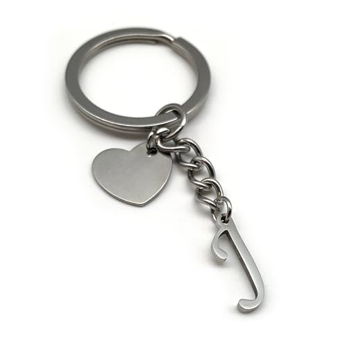 Nyckelring med Bokstav och Hjärta - Namn A-Z brev - Handgjorda hänge i rostfritt stål - Present pojkvän flickvän partner bil (J)